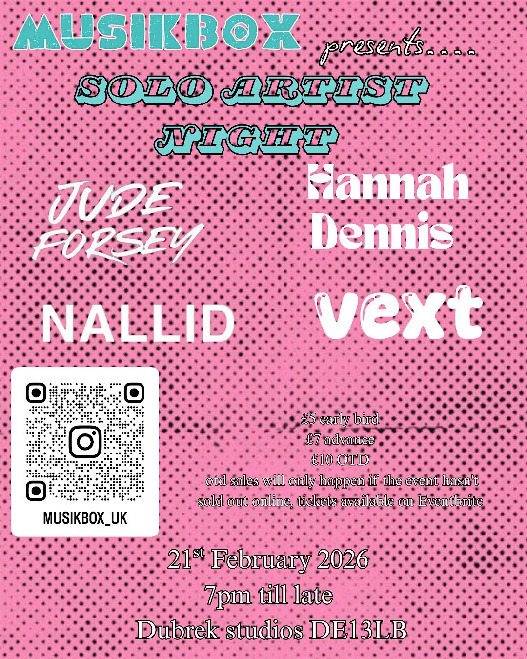 MUSIKBOX is very excited to announce a night of solo artists at Dubrek Studios! Come down and support the local scene.