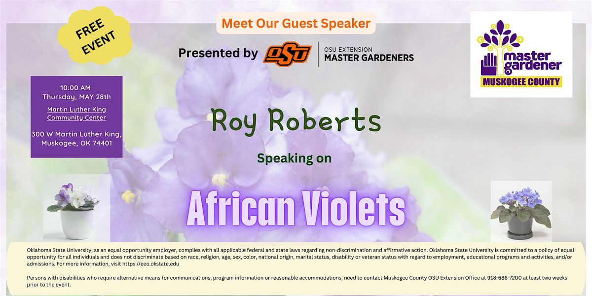 We are excited to announce our upcoming MAY guest speaker, Roy Roberts. He will be speaking on the topic of, "African Violets." This event is FREE for the public to attend on Thursday, MAY 28, 2026 @ 10AM located at the MLK Community Center.