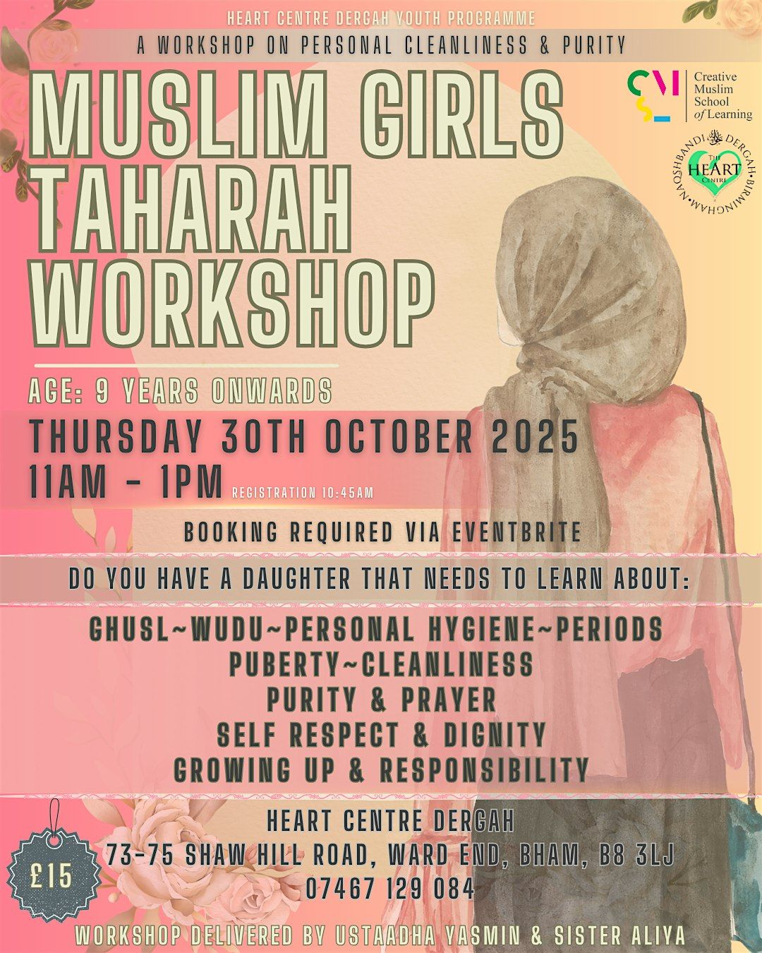 Welcome to the MUSLIM GIRLS TAHARAH WORKSHOP happening at The HeArt Centre Dergah. Join us on October 30, 2025 at 11:00 AM for a session of learning and empowerment. This workshop is designed for Muslim girls to explore the concept of Taharah in a safe and supportive environment. Let's come together to ask questions, and grow in knowledge. Don't miss out on this opportunity to learn and deepen your understanding of this important topic. See you there!