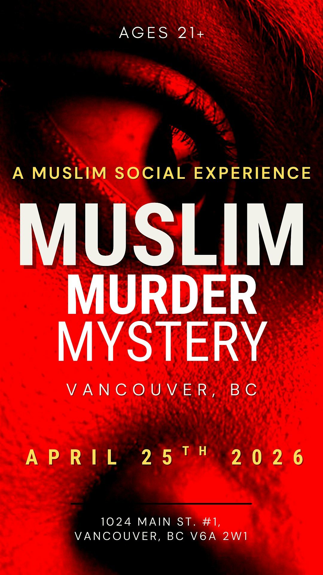 Join Ontario’s #1 Muslim Events Company for an exclusive, high-energy M**der Mystery Social in the heart of Vancouver. This isn’t just a social—it’s an immersive, interactive experience where you are part of the story. Whether you're looking to expand your social circle or find a "partner in crime," this is the place to be.