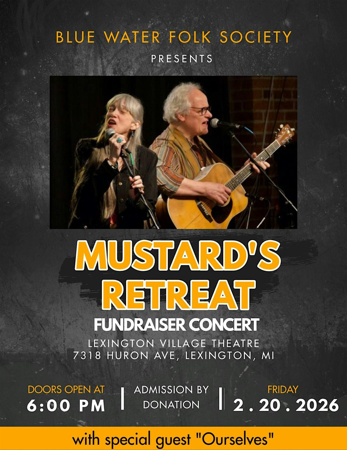 Mustard's Retreat - the dynamic duo of David Tamulevich and Libby Glover - brings five decades of folk magic to the stage with their signature blend of intelligent, thought-provoking, and insightful songwriting. Their music has carried them over a million miles and through more than 6,000 performances, ranging from the prestigious Kennedy Center and The Ark in Ann Arbor to community pig roasts.Now, they are bringing that legendary joyful energy to the Lexington Village Theatre on February 20! Join us for an unforgettable evening supporting the Blue Water Folk Society and Thumbfest 2026.