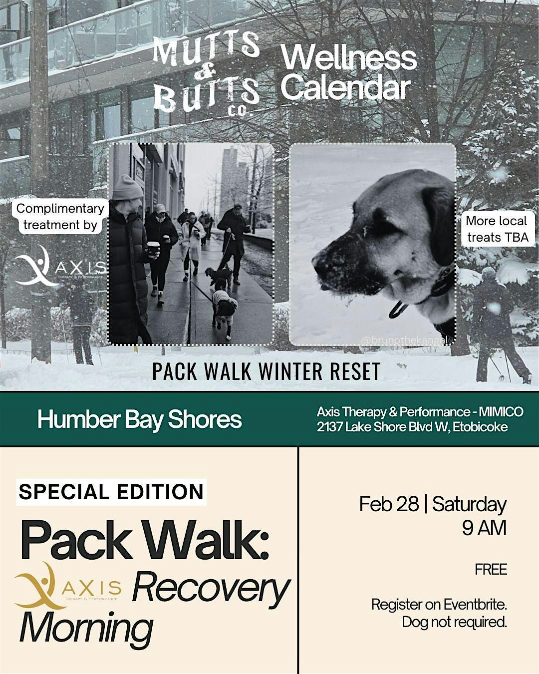 Meet us in Humber Bay Shores for a community pack walk for dogs and humans to regulate, connect, and reset, followed by complimentary treatement at Axis Therapy - Mimico, and other local treats to fuel your morning.