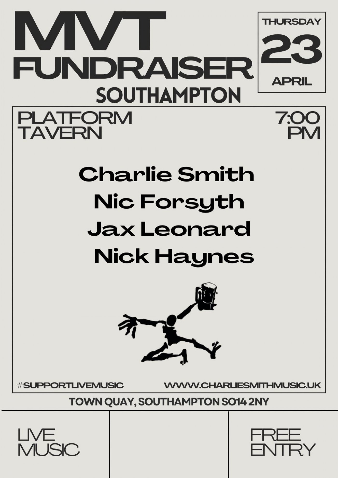 Hi, I'm Charlie Smith, an Alternative Acoustic artist from Hampshire, UK. In April, I will be embarking on my spring tour fundraising for the Music Venue Trust. This will include six different grassroots music venues around England. Join us on Thursday, 23rd April, at the Platform Tavern to show your support for the independent music scene.