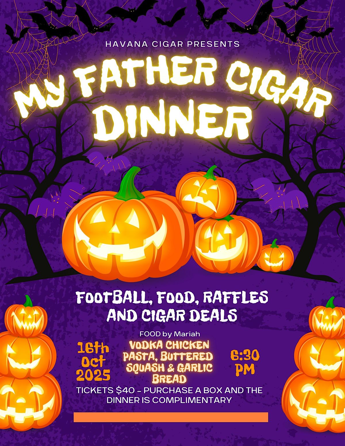October 16th, we will be having a spooky Halloween Dinner by the lovely Mariah and Darren from My Father Cigars ... Tickets are $40 and will include 2 Premium My Father Cigars. the menu will be tasty Chicken and pasta with vodka sauce, buttered squash and garlic bread!! Sign up or Purchase through the link for great deals and merchandise by My Father Cigar