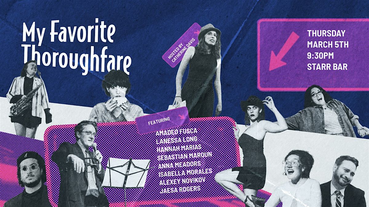 My Favorite Thoroughfare is a comedy variety hour hosted by Catherine Davis, featuring some of NYC’s most exciting clowns, characters, and experimental comedians in acts of devotion to the Brooklyn-Queens Expressway.
