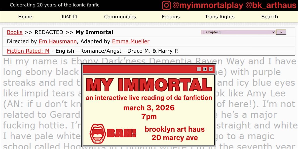 Ebony Dark’ness Dementia Raven Way is a seventeen-year-old goth vampire witch in her seventh year at Hogwarts, tasked with saving the world (and her bf Draco) from Voldymort and the Death Deelers. Join us in celebrating My Immortal, the masterpiece we know and love while raising money for queer theater and trans people, featuring typo-ridden live captions, a costume contest, and more!