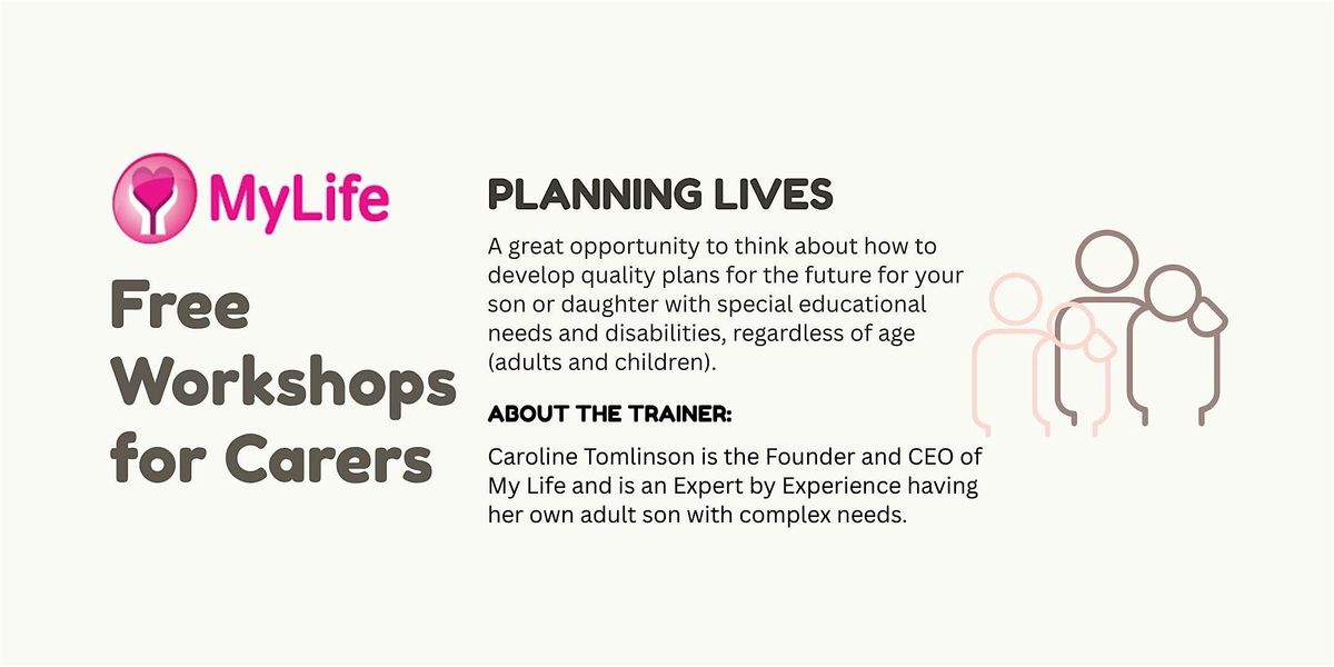 Join us at My Life as part of our series of free workshops for this great opportunity to think about how to develop quality plans for the future for your son or daughter with special educational needs and disabilities, regardless of age (adults and Children). This short workshop will guide you through what you need to think about and how to plan it in an easy to understand way.