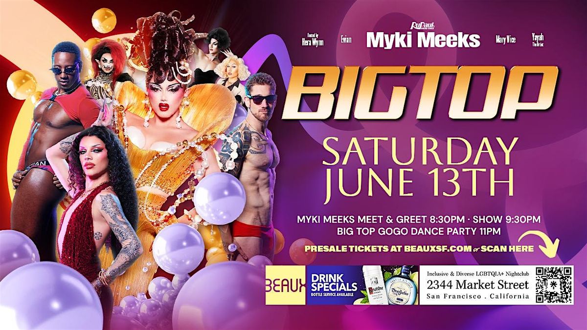 Myki Meeks the darling of Rupaul's Drag Race Season 18 is coming to turn the party at BIG TOP SATURDAY only at BEAUX IN THE CASTRO to celebrate SF PRIDE MONTH. Big Top is now monthly on Saturday nights to offer the best in nightclub entertainment.