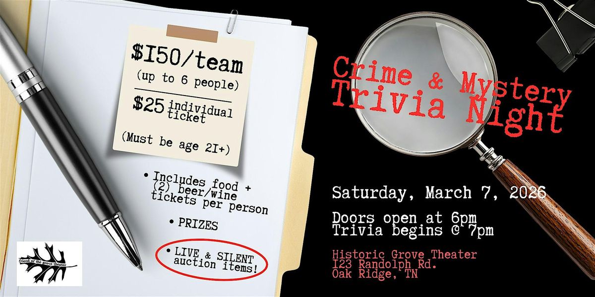 Find your inner sleuth! The theme for this trivia night at the Grove Theater is mystery/crime events throughout history - so track down a group of friends to form a team, and join the fun!