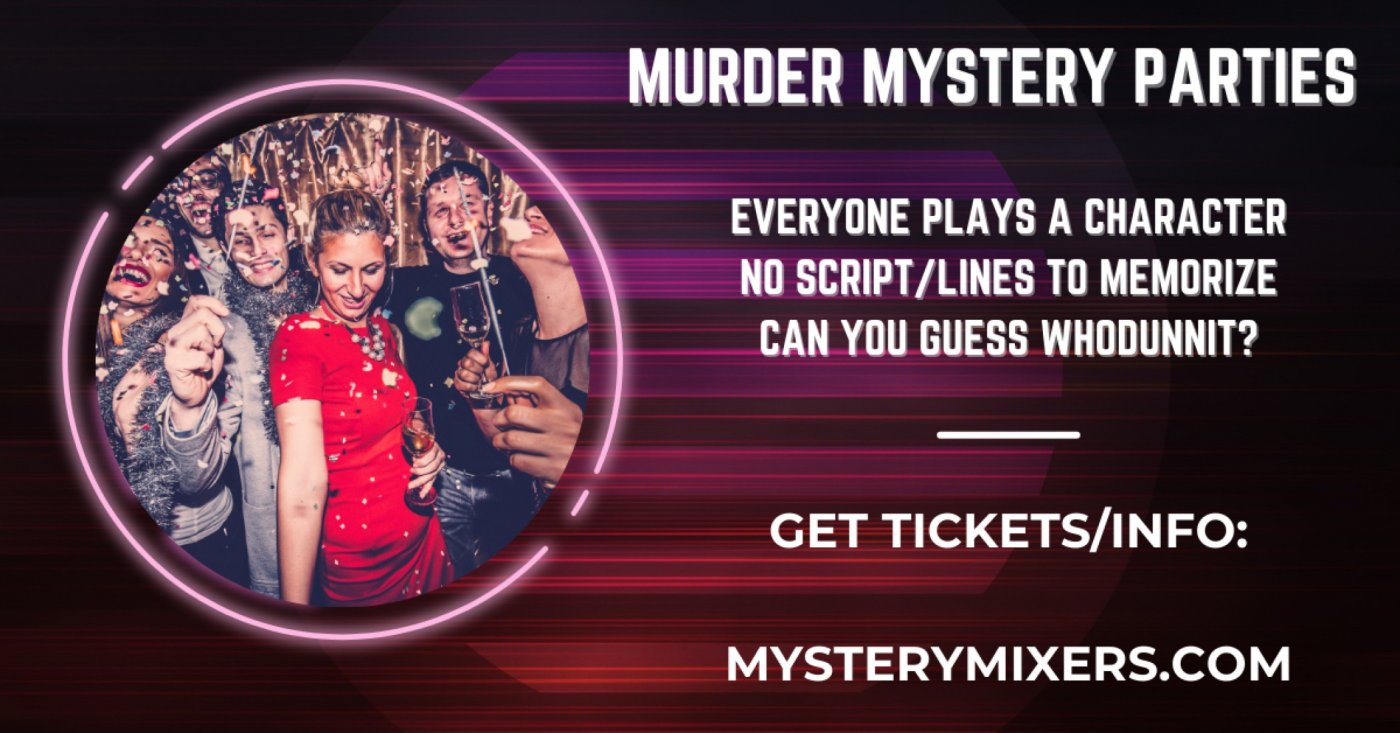 The Experience: It’s the adult version of make-believe—with a cocktail in hand. Mix, mingle, and follow the clues until we find out who-dunnit! This is NOT a dinner show! There is no audience, no lines to recite and no stage. This is a mixing/mingling PARTY!
