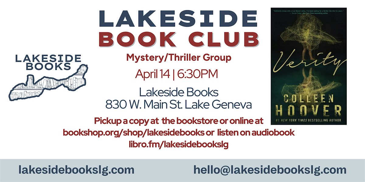 The next mystery/thriller book club read is Verity by Colleen Hoover! Purchase books at the bookstore or online at bookshop.org/shop/lakesidebooks or listen on audiobook libro.fm/lakesidebookslg. Please RSVP so we have an accurate headcount. If you cannot join after you RSVP, please email so we can open up your seat. Please also join our Facebook Group for updates.