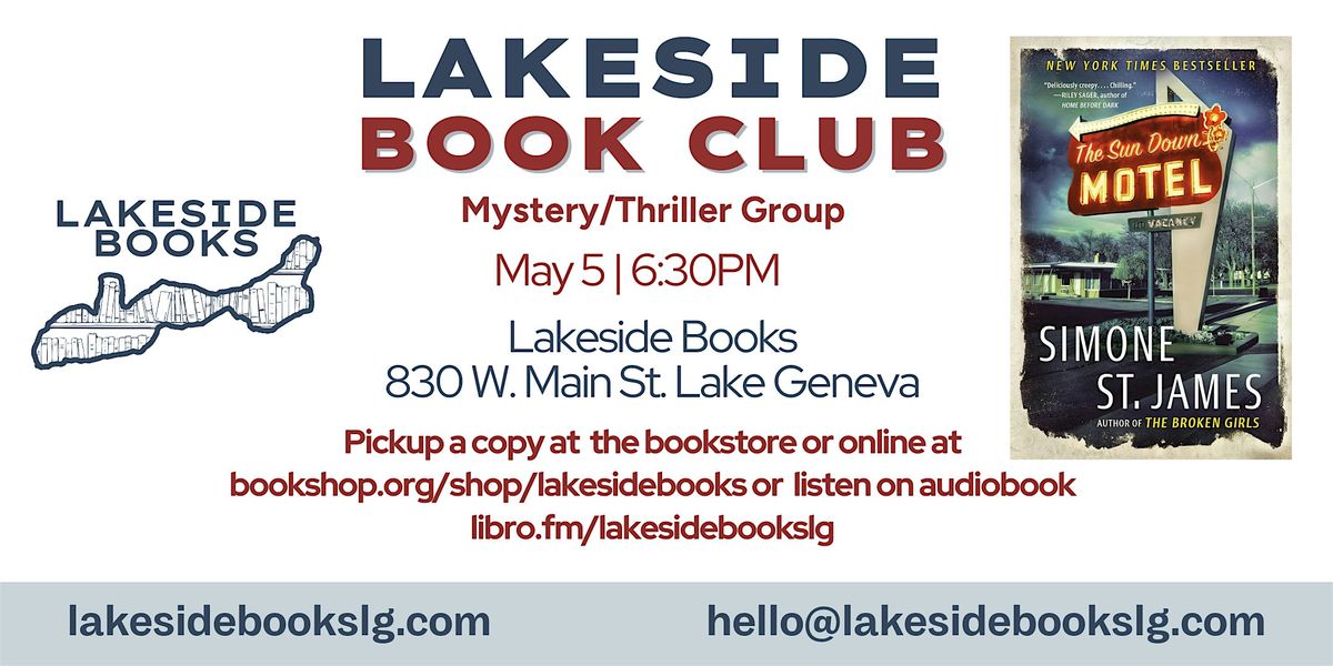 The next mystery/thriller book club read is Sun Down Motel! Purchase books at the bookstore or online at bookshop.org/shop/lakesidebooks or listen on audiobook libro.fm/lakesidebookslg. Please RSVP so we have an accurate headcount. If you cannot join after you RSVP, please email us so we can open up your seat. Please also join our Facebook Group for updates.