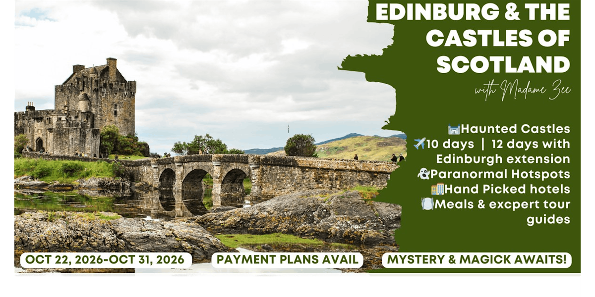 Join psychic, paranormal investigator, and witchy tour guide Madame Zee on a once-in-a-lifetime journey through the haunted heart of Scotland. This isn’t your average vacation — this is an immersive exploration of curses, castles, spirits, and Scottish legends.