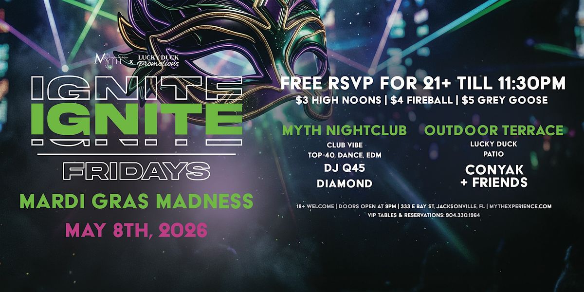 Step into IGNITE FRIDAYS as we bring the wild energy of Mardi Gras Madness to Myth. Expect vibrant colors, nonstop music, and a full night of high-energy vibes across two party zones.