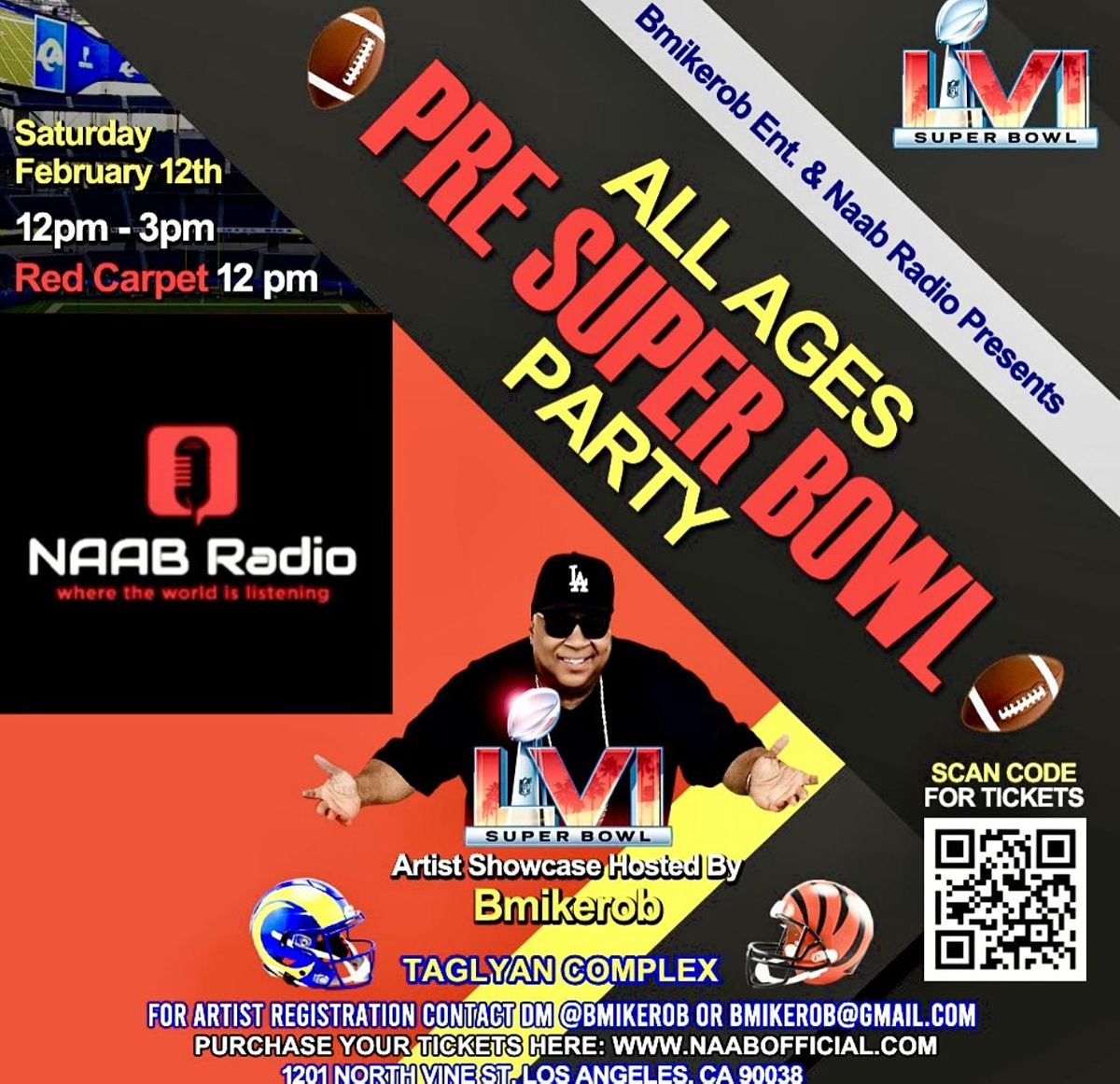 FOOTBALL LOVERS, THE BIG NIGHT IS COMING TO INGLEWOOD CALIFORNIA, AND WE ARE INVITING EVERYONE TO COME JOIN BMIKEROB ENT. & NAAB RADIO‘S DAYTIME SUPER BOWL LVI TALENT SHOWCASE.