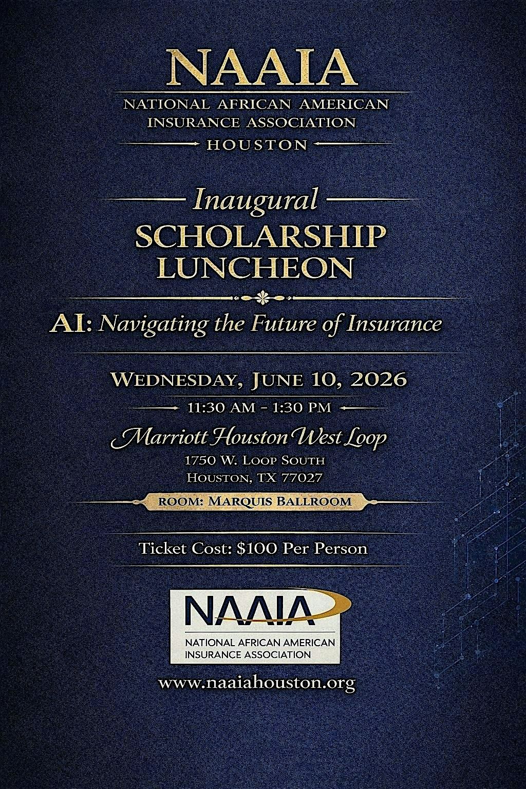 As a cornerstone of this event, NAAIA Houston will award two $1,000 scholarships to undergraduate college students who are pursuing insurance‑related fields. These scholarships represent NAAIA Houston’s investment in emerging talent and its mission to expand access, opportunity, and leadership within the industry.