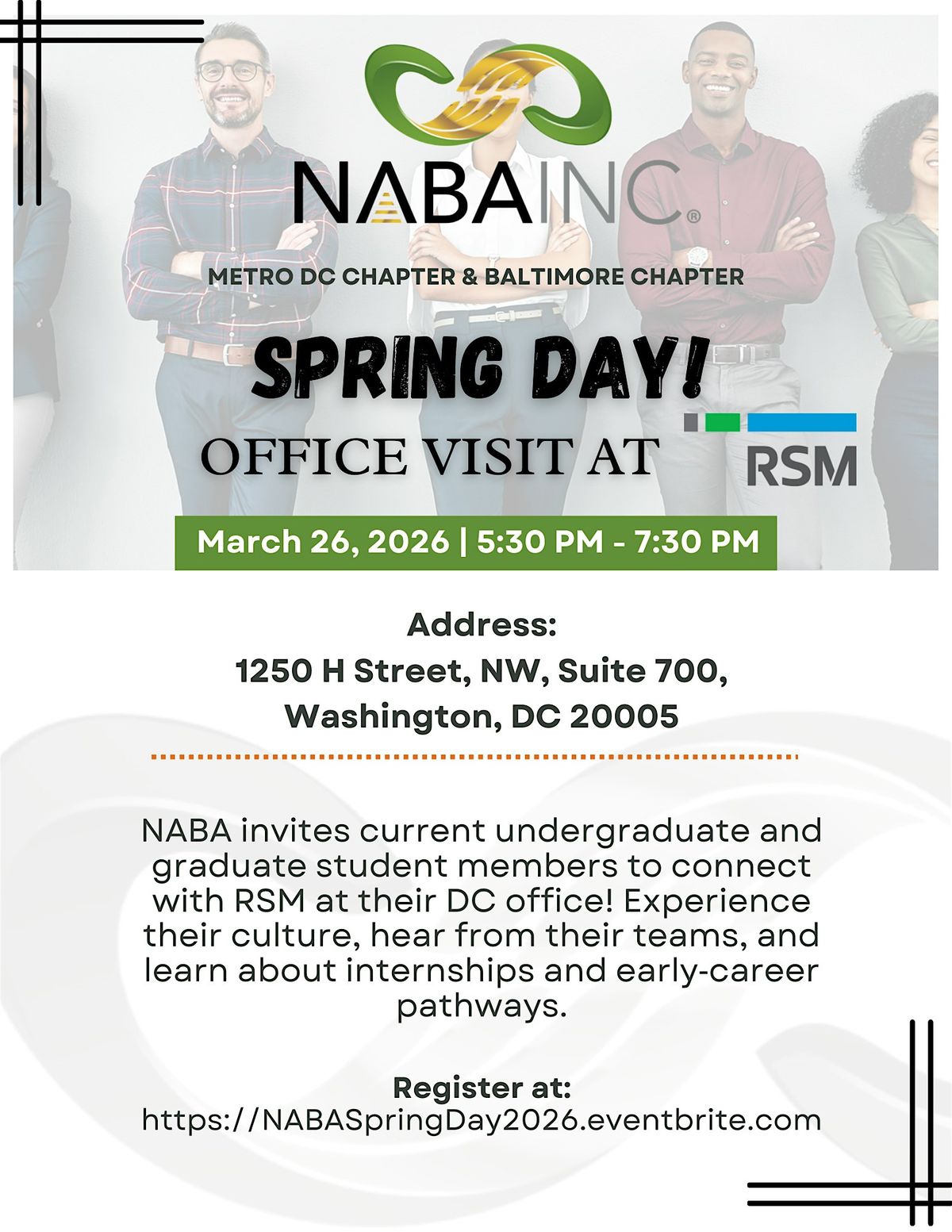 The NABA Metro DC Chapter, in proud partnership with RSM, is pleased to host this year’s Spring Day at RSM's Washington, DC office! This is a student‑focused event designed to introduce students to: