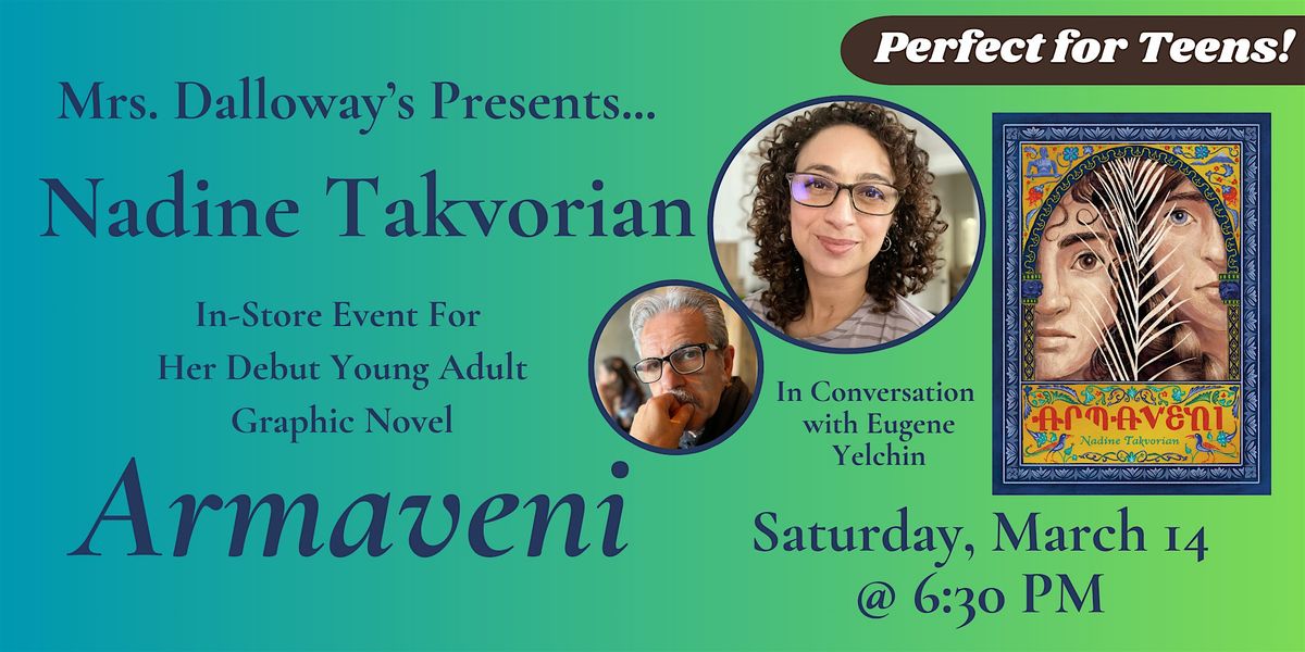 Join us at Mrs. Dalloway's Bookstore on Saturday, March 14 at 6:30 when debut author/illustrator Nadine Takvorian comes to the store to share her new book for young adults Armaveni: A Graphic Novel of the Armenian Genocide. Nadine will be joined in conversation by Eugne Yelchin and will sign copies of her book after the presentation.