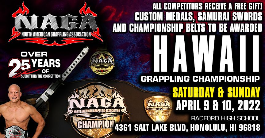 This information is in reference to the Adult & Teens day for NAGA Hawaii. Information for Children's (13 & under) day (4/10/22) can be found in a separate Facebook event.The North American Grappling Association (NAGA) comes to Radford High School in Honolulu, HI on Saturday, April 9, 2022. The NAGA Hawaii Grappling Championship, Adults and Teens (14-17) day, is a no-gi and gi (BJJ) grappling tournament with divisions for all skill levels and all ages. Expert division winners are awarded championship belts. Non-expert children and teen division winners are awarded samurai swords. Adult non-expert winners are awarded medals.