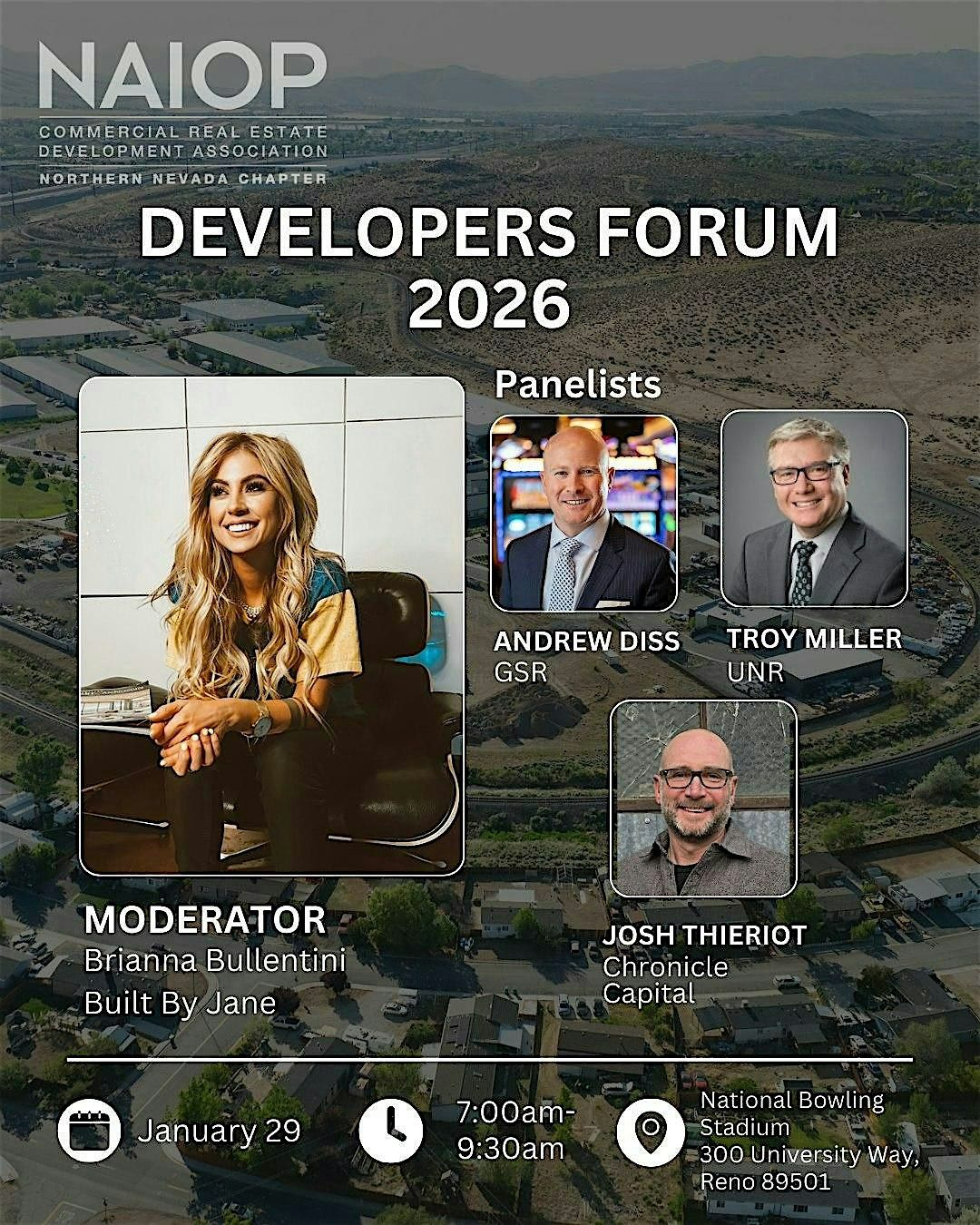 The NAIOP Developers Forum 2026 will feature the results of the Fall 2025 Northern Nevada CRE Sentiment Survey and interviews with a panel of regional industry experts, with a special focus on current downtown Reno projects.