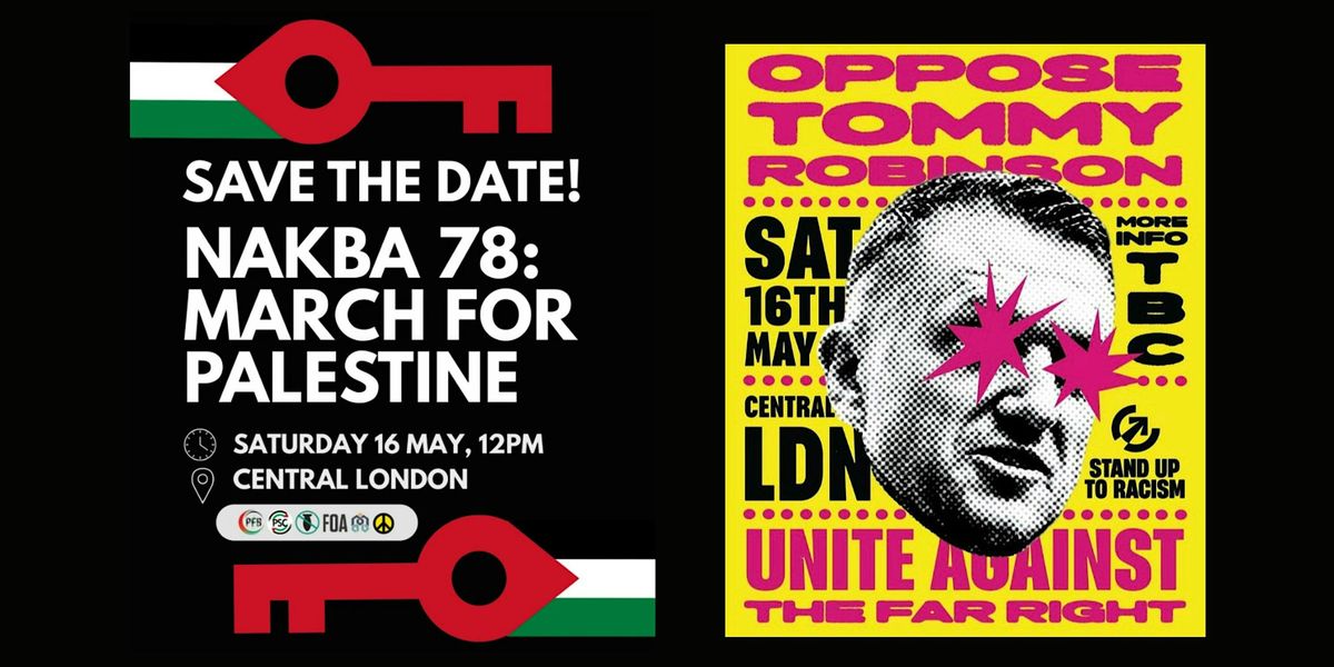 Shamefully, the police have allowed 'Tommy Robinson', fascist figurehead and vicious Islamophobe, to march in London on Nakba Day. Robinson's content and events are riddled with anti-Palestinian racism. He knows that the mass movement for Palestine that has brought together millions of people for peace, freedom, justice and equality is a direct threat to his fascist project, and he has repeatedly targeted the movement.