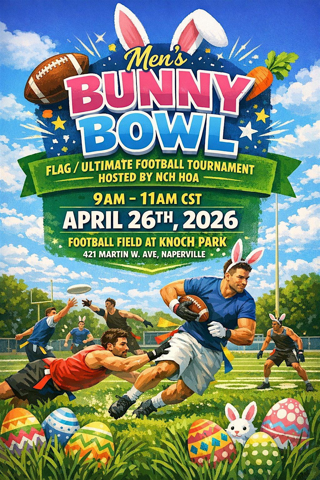 We are two weeks away from our HOA’s annual Men’s BunnyBowl tournament for Ultimate/Flag Football on April 26th from 9 AM - 11 AM at the Knoch Park Turf Field: 421 W Martin Ave, Naperville, IL 60540