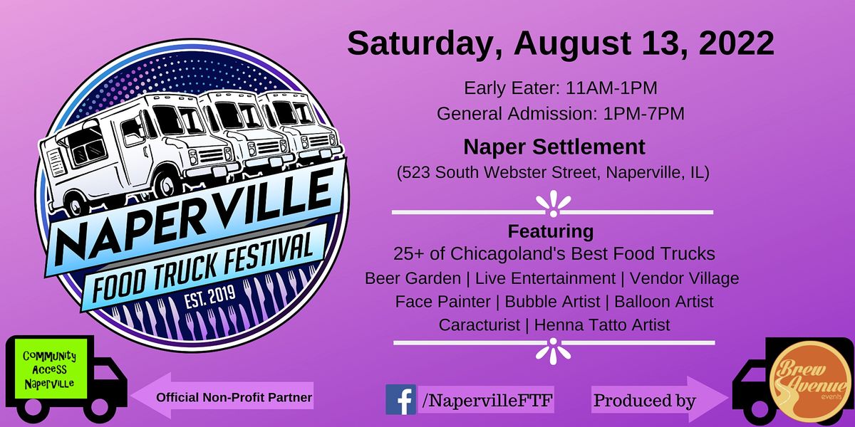 Calling all Foodies! We're returning to the Naper Settlement - the heart of downtown Naperville, to bring you the Summer Naperville Food Truck Festival. Featuring 25+ of the area's best food trucks, live entertainment, beer garden, face painter, mega bubble artist, caricaturist, balloon artist, henna artist and a vendor village featuring local businesses.