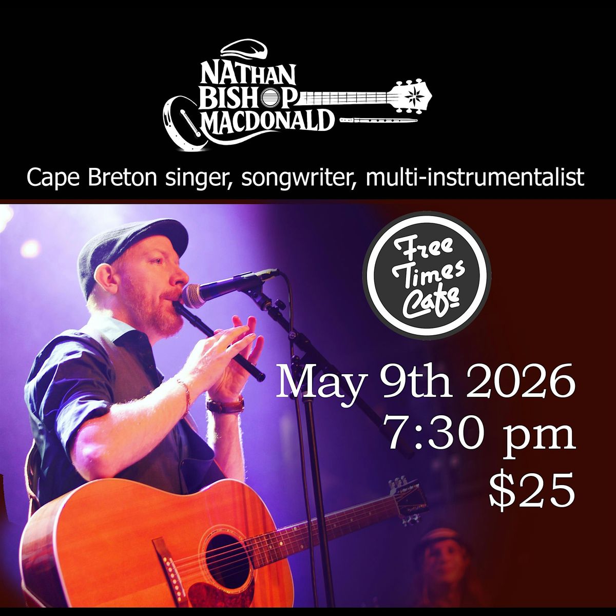 Veteran Cape Breton Singer Songwriter, Nathan Bishop MacDonald (Celtae, Finlaggan, Nathan Bishop Band), will bring his unique brand of original Celtic folk fused with contemporary influences to Toronto on May 9th, 2026. Nathan's songs draw on the seafaring and working class stories of Atlantic Canada with a sound that is both traditional and a breath of fresh air. He seamlessly glides between guitar, bodhrán, tin whistle, and harmonica in an unforgettable show that brings audiences along through lighthearted romps, poignant ballads, and upbeat anthems. Show begins at 7:30. Ticket holders are welcome to stay for the show that follows at 10 pm. One drink minimum per customer. Pre-show dinner reservations are available from 6-7pm by calling Free Time Cafe at 416-967-1078.