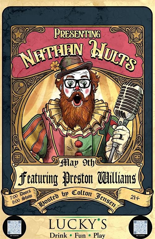 Join us for a wild ride of outrageous humor and unforgettable antics, featuring Headliner Nathan Hults, the master of clever wit and side-splitting observational comedy. Preston Williams brings his unique comedic flair to the stage as our featured act, sure to leave you in stitches with his hilarious antics and sharp one-liners.