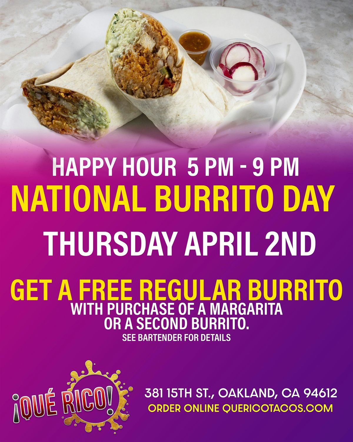 Join us at Que Rico Nightclub and Restaurant on April 2, 2026 at 5:00 PM for an awesome Burrito Day special.