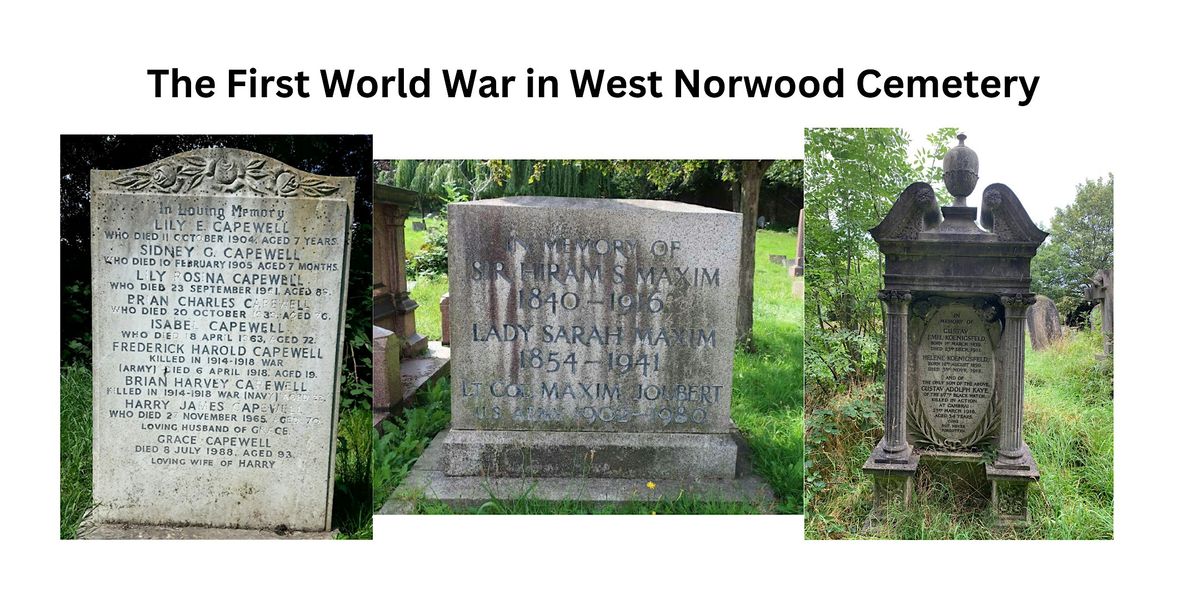 There are commemorations of over 600 service personnel fatal casualties from the First World War in West Norwood Cemetery. This walk, lasting some 2 hours, will visit 20 monuments, including those of several civilians, with the aim of discovering what these memorials tell us about the way the war was fought and the technological advancements that enabled the stalemate to be broken, as well as aspects of the human tragedies involved.