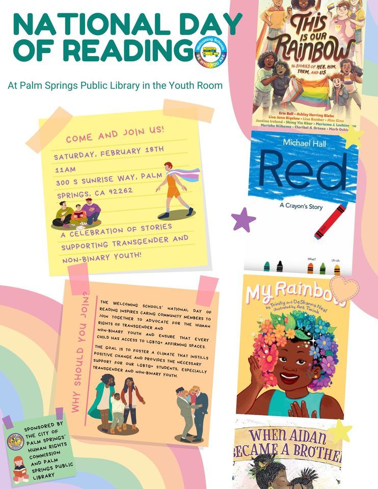 This is a free event, co-sponsored by the City of Palm Springs' Human Rights Commission, Queer Works, and the Palm Springs Public Library. After a national anti-LGBTQ+ hate group bullied a young transgender girl in Mount Horeb, Wisconsin, her community rallied behind her by hosting a community reading of "I Am Jazz" by transgender advocate Jazz Jennings. Every year, in honor of the Mount Horeb community’s allyship, communities across the country join the Human Rights Campaign's Welcoming Schools program for its annual National Day of Reading: A Celebration of Stories Supporting Transgender and Non-Binary Youth. While the current climate of our nation can make it difficult to instill positive change and provide the necessary support for our LGBTQ+ students, we want to focus and uplift the fact that there are many supportive organizations, such as ours, places of worship, schools and people who continue to show up for our transgender and non-binary youth. Please join Mayor Grace Garner, Jeannie Kays, Director of Library Services, Jacob Rostovsky, Founder & CEO, Queer Works and others, as they read to those young and young-at-heart, to join our community together to advocate for the human rights of transgender and non-binary youth and ensure that every child has the support needed to thrive and be their whole self in their school and community.