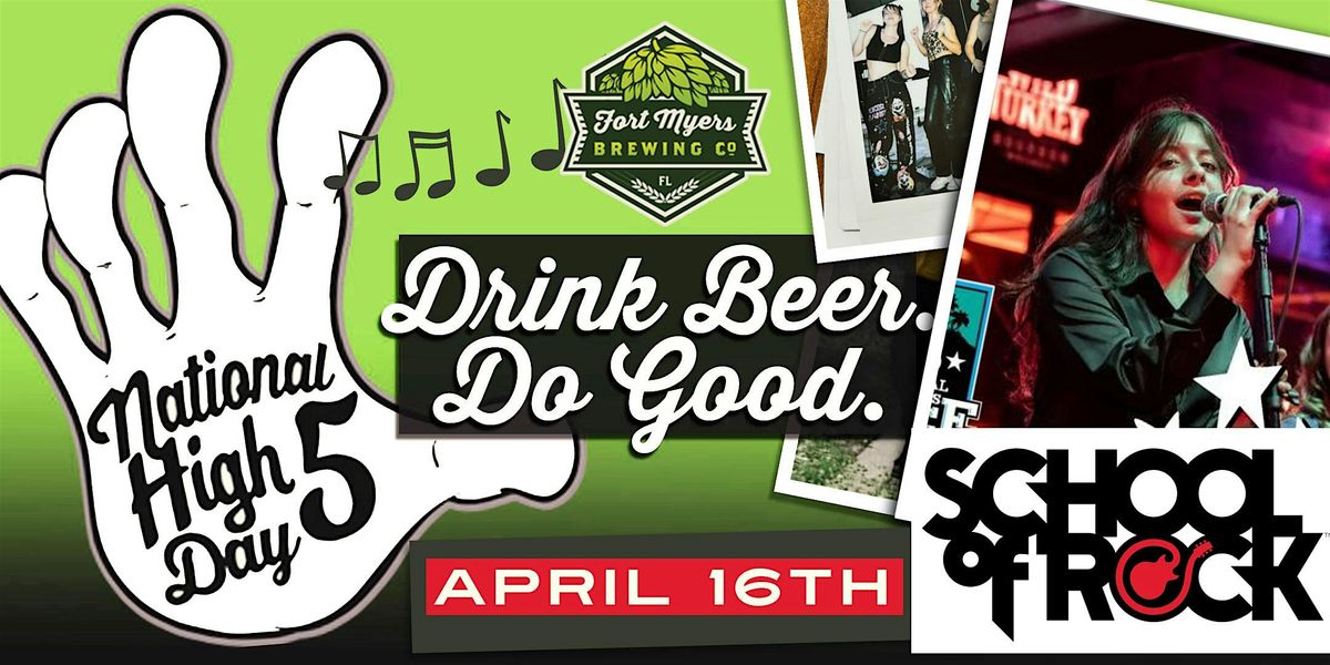 Join us at FMBrew on Thursday, April 16th for #NationalHigh5Day, a day dedicated to giving high fives and spreading good vibes. In the spirit of #NationalHigh5Day, we will donate proceeds from every High 5 IPA sold in the taproom to a foundation that embodies positivity and this feel-good initiative.Live Music: School of Rock Fort Myers performs at 6pm!