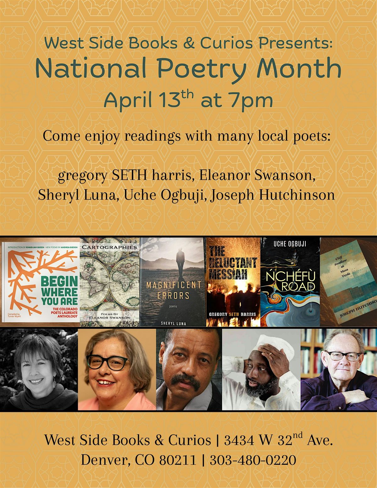 West Side Books presents a National Poetry Month celebration on Monday, April 13th with many CO poets: gregory SETH harris, Eleanor Swanson, Sheryl Luna, Uche Ogbuji, Joseph Hutchinson. 7pm onward.