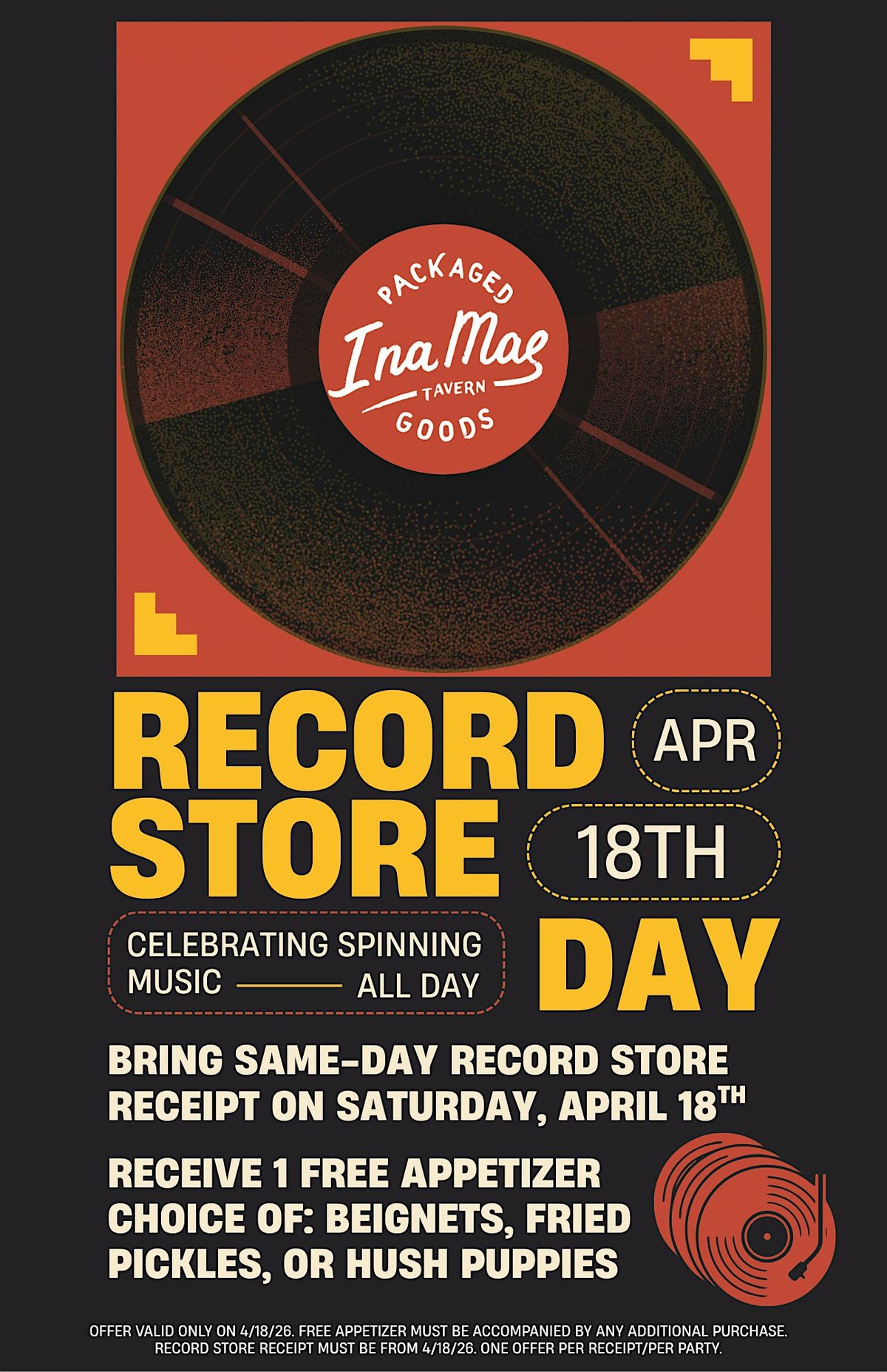 When you're done - head over to Ina Mae Tavern in Wicker Park and bring your same-day record store receipt to receive 1 free appetizer (Beignets, Fried Pickles, or Hush Puppies).