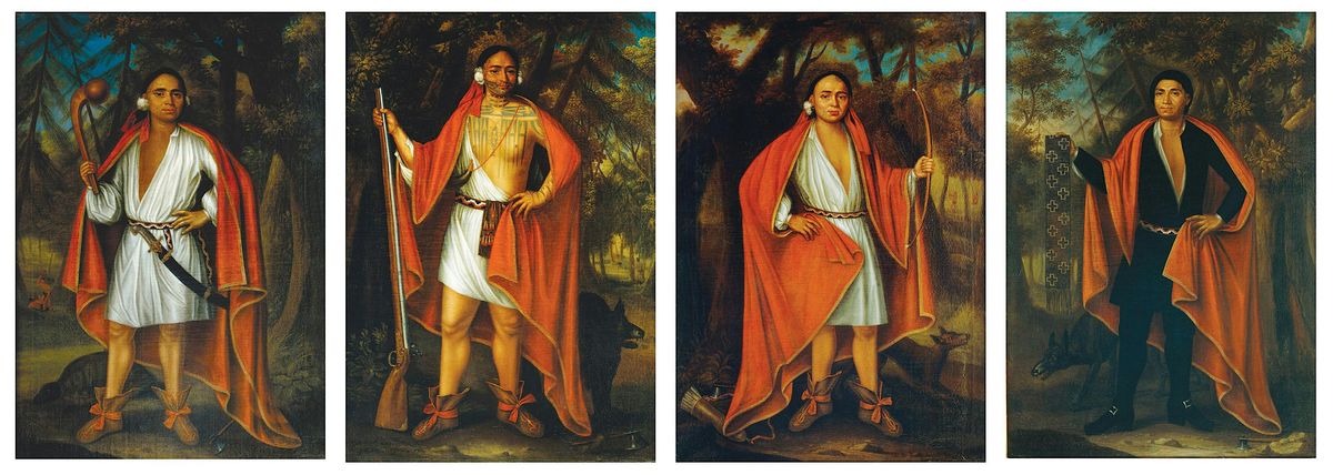 Images: Four Indian Kings painted by John Verelst, 1710 (detail). From left to right: Etow Oh Koam (Mohican), Sa Ga Yeath Qua Pieth Tow, Ho Nee Yeath Taw No Row, and Tee Yee Ho Ga Row, Courtesy National Archives of Canada, Ottawa, Ontario, Canada. The Landing of Henrik Hudson, Courtesy Gilder Lehrman Institute of American History. Images for educational use only.