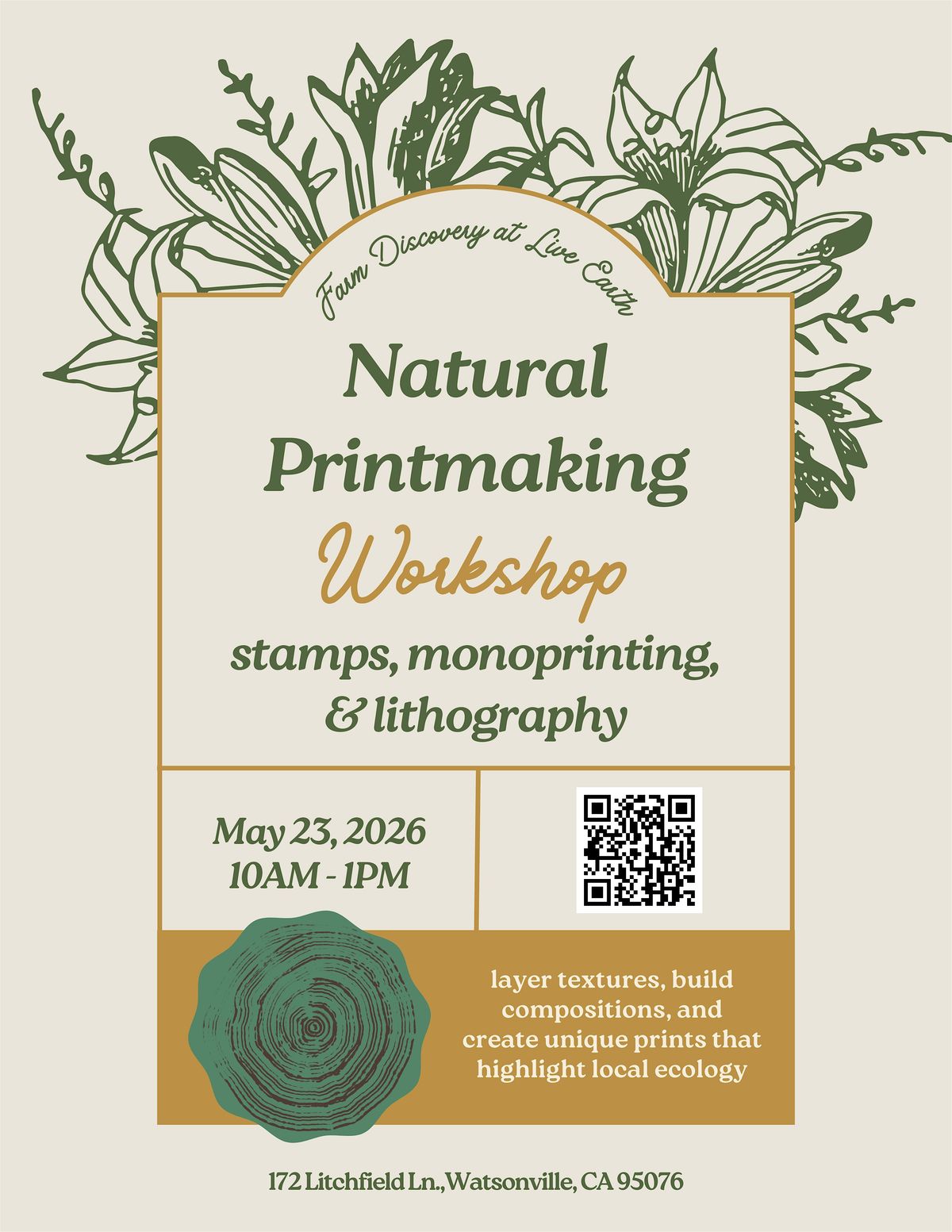 Discover the shapes, textures, and patterns of the farm in this printmaking experience. Participants will gather and work with materials ethically and sustainably sourced from the farm—leaves, flowers, spores, fibers, and other organic elements—to explore stamp-making, monoprinting, lithography, and layered compositions. Guided exercises encourage close observation of the farm’s flora & fauna, soils, and landscapes, allowing each particiapnt to translate local ecology into unique, textured prints that capture the character of the land.