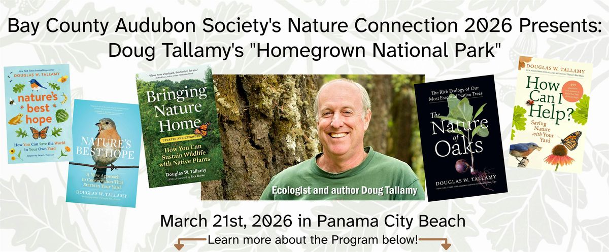 Bay County Audubon Society's Nature Connection 2026 Program is bringing Doug Tallamy - Ph.D., American entomologist, and native plant conservationist behind the Homegrown National Park movement - to Captain Anderson’s Event Center (nearby the famous Restaurant) on Panama City Beach. Love the Nature Connection focus on wildlife, ecology, and education? Scott Rashid - Owl Expert from Estes Park, Colorado, and author, watercolorist, and bird rehabilitator - will be coming to the area for a presentation at the FSU Holley Center on March 28th. Click the Scott Rashid link at the bottom of this post for more on his Nature Connection 2026 event, including tickets.