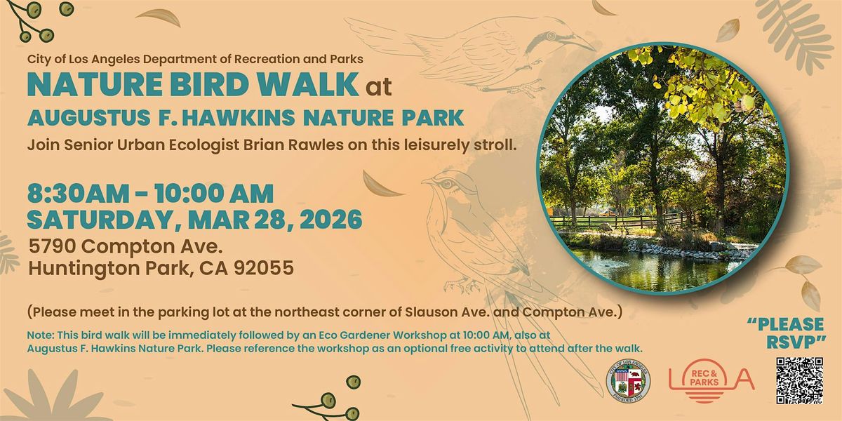 Note: This bird walk will be immediately followed by an Eco Gardener Workshop at 10:00 AM, also at Augustus F. Hawkins Nature Park.