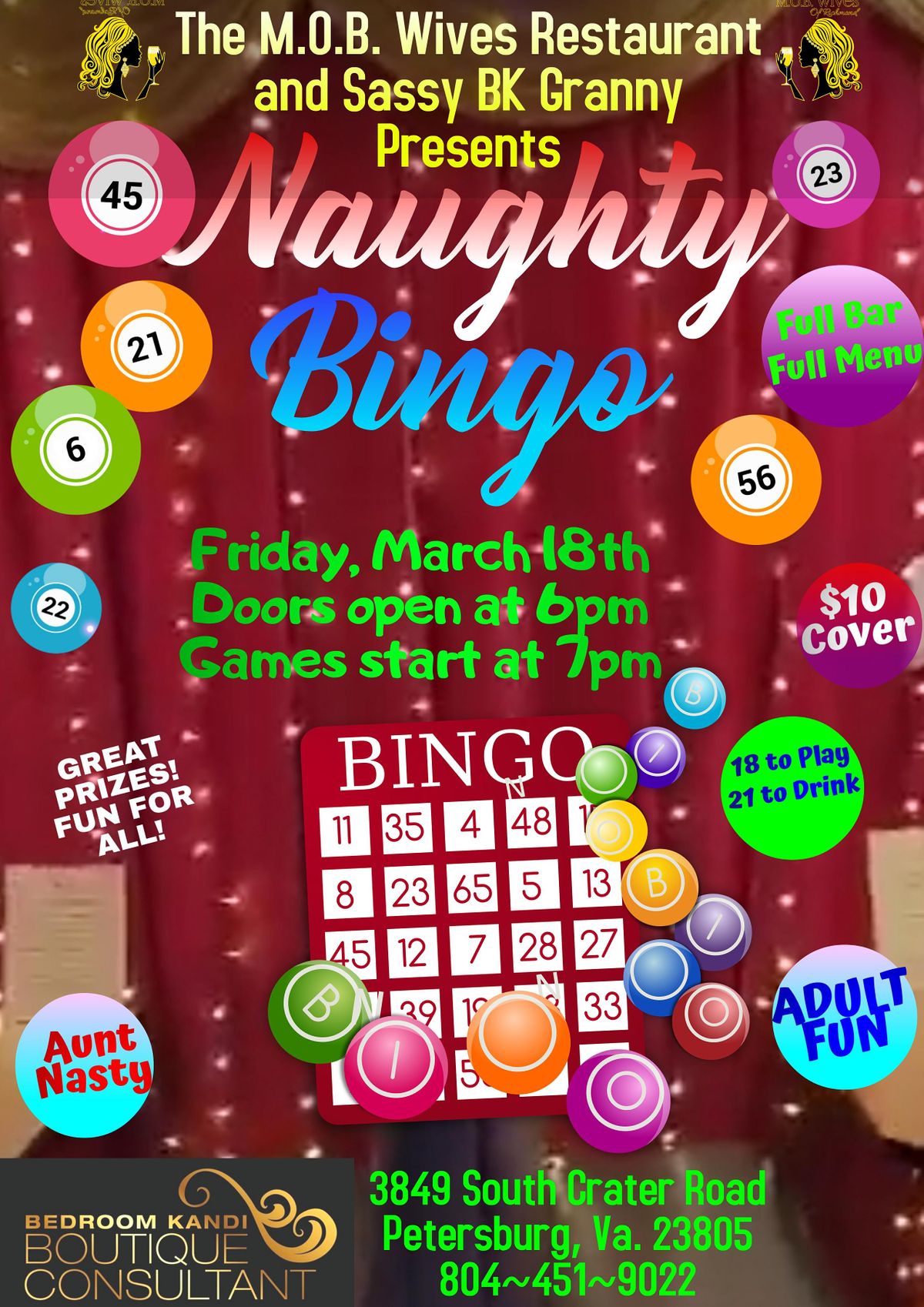 Presents a night of Naughty Bingo Games, Music, Food & Drinks hosted by Sassy BK Granny and Aunty Nasty. You can WIN some NASTY and FUN PRIZES ~ Plan to try OUR signature "My 600lb Life Burger"! or any of our other amazing daily menu items and Drink Specials.