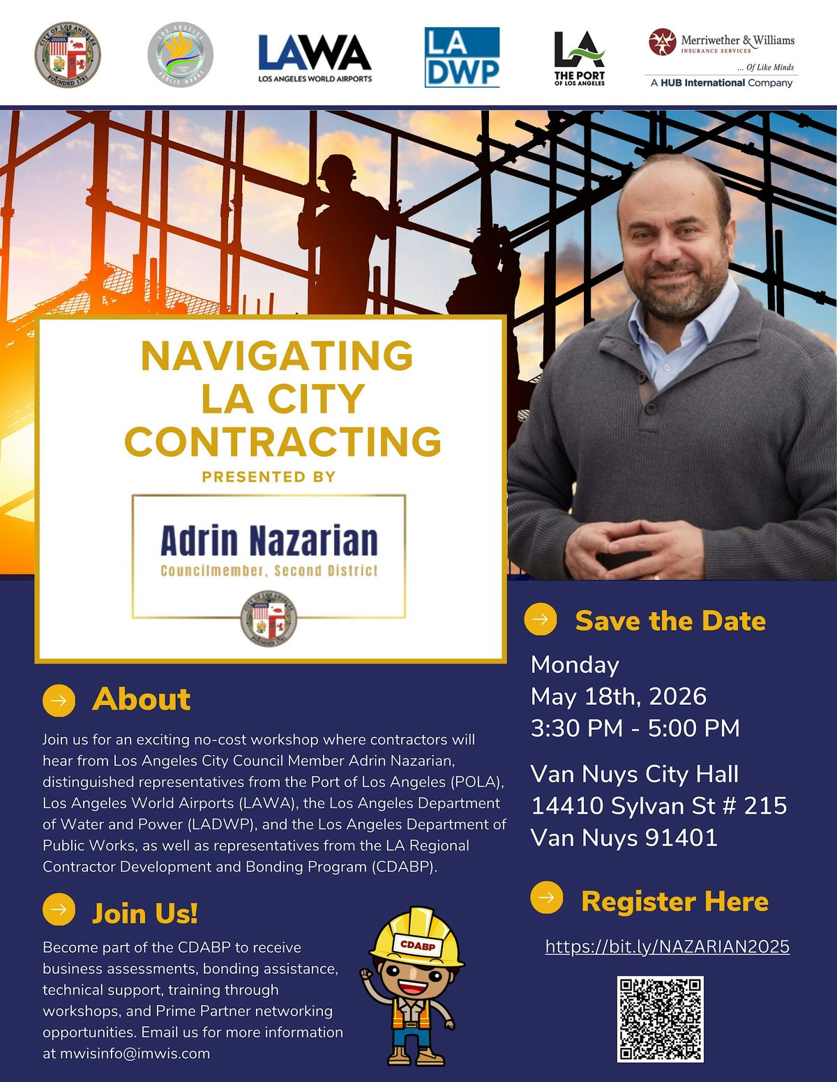 Join Los Angeles City Council Member Adrin Nazarian on May 18th to explore the many valuable resources available to small, local, and diverse contractors in the City of Los Angeles, and to find out about upcoming opportunities in Council District 2 and beyond!