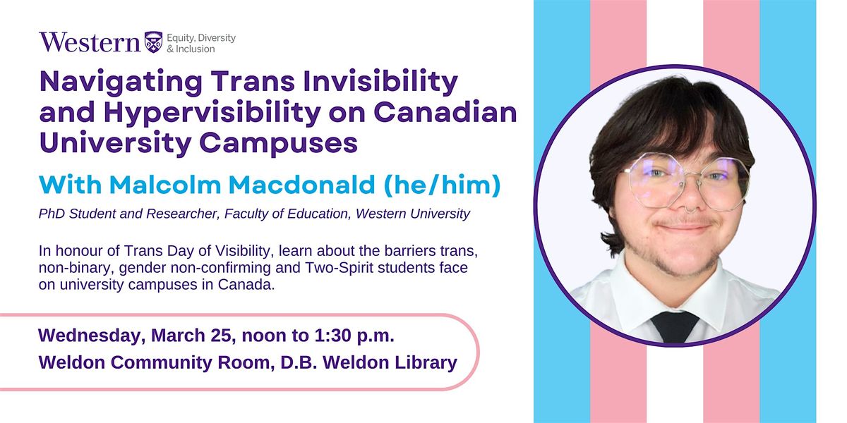 What does it mean to live a ‘visibly trans’ life on campus? And where does invisibility end, and hyper visibility begin? Join Malcolm Macdonald and the Office of EDI to explore these questions, and learn about some of the barriers trans, non-binary, gender non-conforming, and Two-Spirit students face on university campuses in Canada.