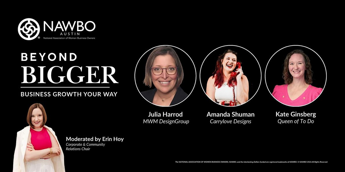 Join NAWBO Austin for our April luncheon featuring a dynamic panel of business leaders—Julia Harrod, Amanda Shuman, and Kate Ginsberg—who will explore what growth can truly look like for today’s entrepreneurs. From scaling teams and expanding services to intentionally staying lean, this conversation will unpack the strategic, financial, and cultural decisions that come with reaching the next level in business.