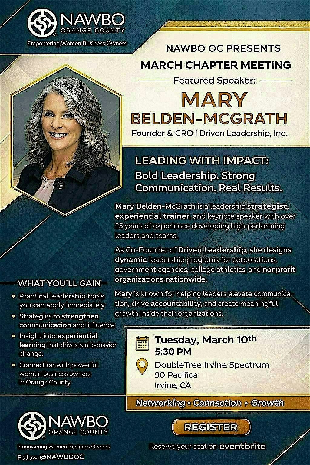 Join NAWBO Orange County for an impactful evening with leadership strategist Mary Belden-McGrath, Founder & CRO of Driven Leadership, Inc.With 25+ years of experience developing high-performing leaders, including teams at Google, PepsiCo, and Kaiser Permanente. Mary delivers practical, results-driven strategies that elevate communication, accountability, and leadership effectiveness.