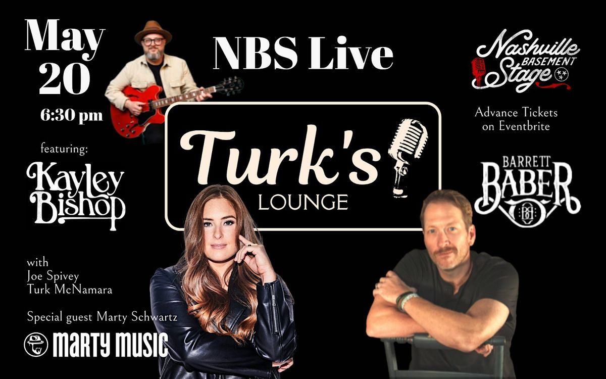 Nashville Basement Stage brings one of Nashville's top voices, Kayley Bishop, together with the world's most popular guitar instructor, Marty Schwartz, better known as Marty Music on YouTube. Marty will be accompanying the round with hall of fame fiddler, Joe Spivey. Barrett Babe, fellow The Voice contestant like Kayley, will be joining the round with Turk's owner, Sean 'Turk' McNamara.
