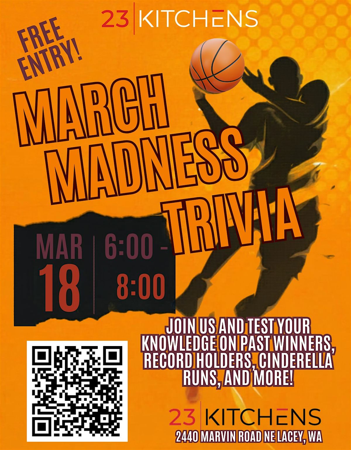 Get ready for a fun night of March Madness trivia at 23 Kitchens! Join us on March 18, 2026 at 6:00 PM (Pacific Time) to test your NCAA knowledge, enjoy some great company, and maybe even win some bragging rights. Whether you're a basketball fanatic or just in it for the laughs, this is the perfect way to kick off the madness season. Don’t miss out on the fun – see you there!