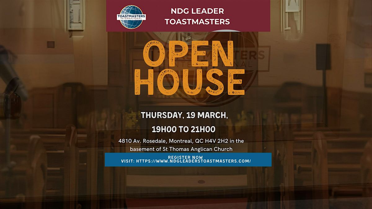 Join NDG Leaders Toastmasters for a special Open House on Thursday, March 19, 2026, from 7:00 PM to 9:00 PM in Montreal’s NDG community.