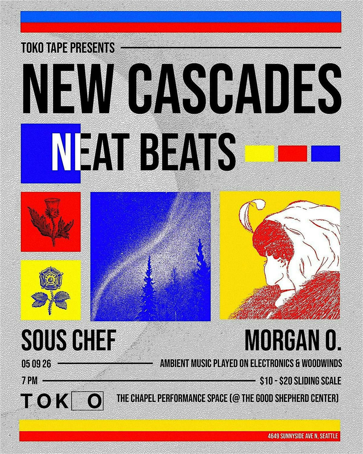 In celebration of the cassette release for “new cascades”, the 2024 album from Portland-based producer Alvin Fenner (neat beats), TOKO TAPE is proud to present an evening of woodwinds and electronics echoing through the halls of the Chapel performance space. Fenner will be joined by local Seattle saxophone player, Morgan O., and multi-instrumental sound artist, Sous Chef. In addition to the music, Portland-based tea pop-up, Apa Kabar, will be serving a curated selection of loose-leaf teas.