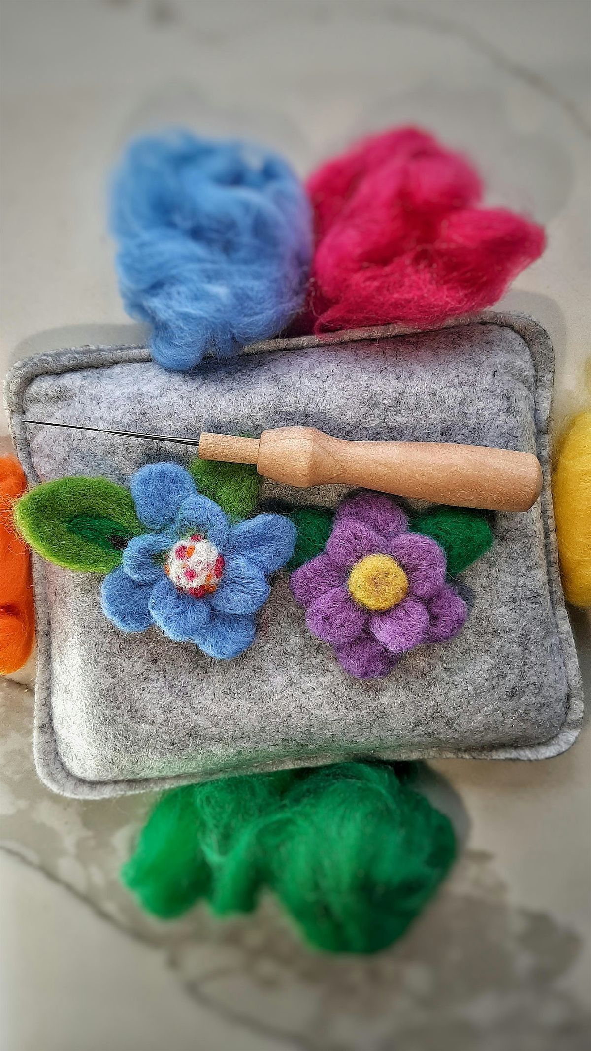 Join us for an evening of needle felting! You will learn how to make your very own felted flowers and turn them into a wearable brooch. All essential materials are provided, enough to make 2 felted flowers.