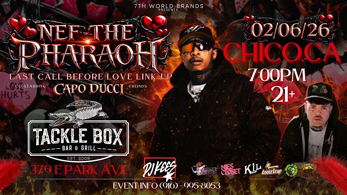 Chico, it’s time to turn the volume up right before Valentine’s season hits. Nef The Pharaoh is pulling up to Tackle Box Bar & Grill for a high-energy night of authentic Bay Area hip-hop, real crowd interaction, and a full-on concert vibe. Co-starring Capo Ducci + friends, with DJ Kees on deck to keep the room moving between sets.